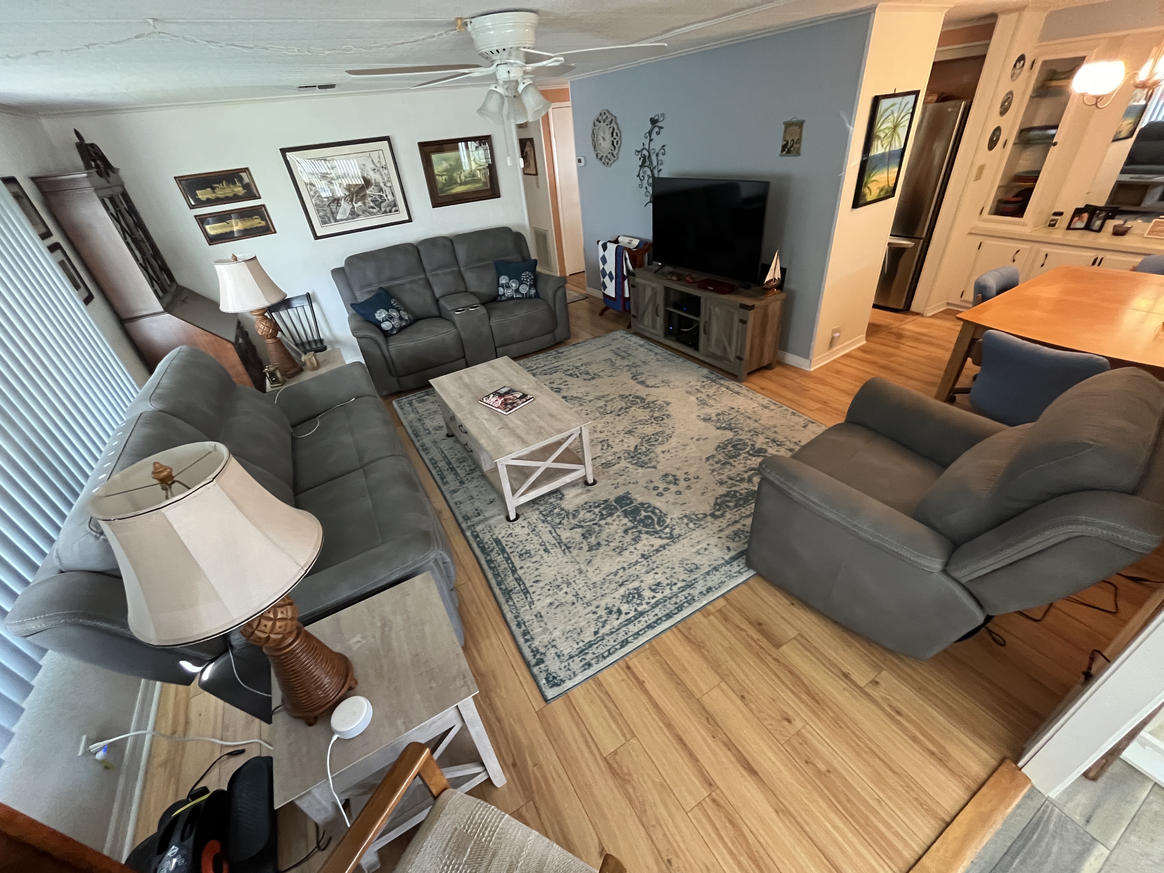The open-concept living and dining areas are perfect for entertaining, with directional lighting and a beautiful set of Ashley Furniture leather power-reclining pieces that create a cozy, welcoming atmosphere.