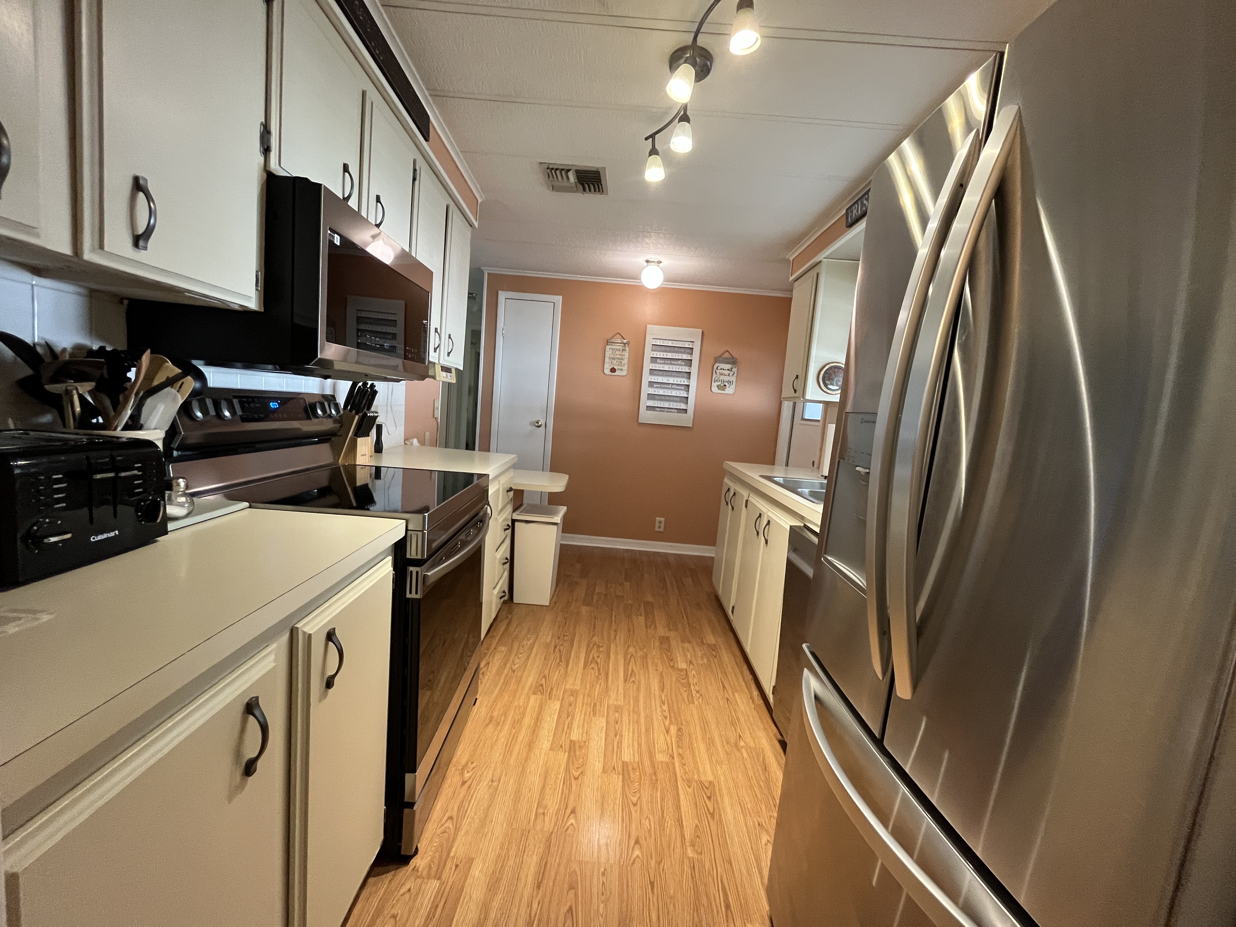 The kitchen is well-equipped for everyday living or hosting friends, featuring brand-new 2024 appliances: refrigerator, stove, dishwasher, and microwave.