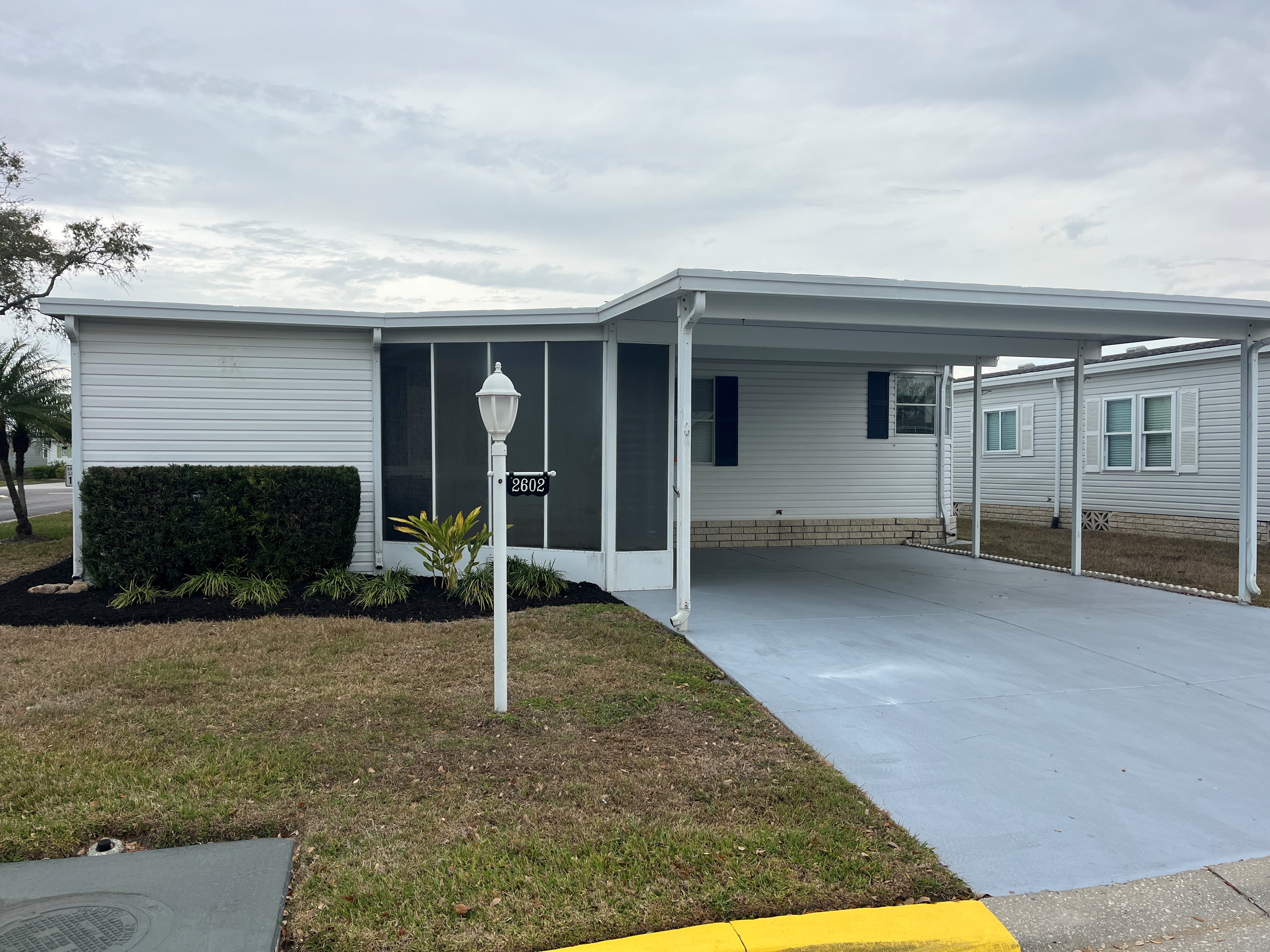 Discounted Lot Rent for Serious Buyers!! This Palm Harbor Home is a 2 bedroom, 2 bath Double wide covered carport sitting on corner lot with New Master shower, New kitchen Cabinets, Complete Home was repiped with new water lines.