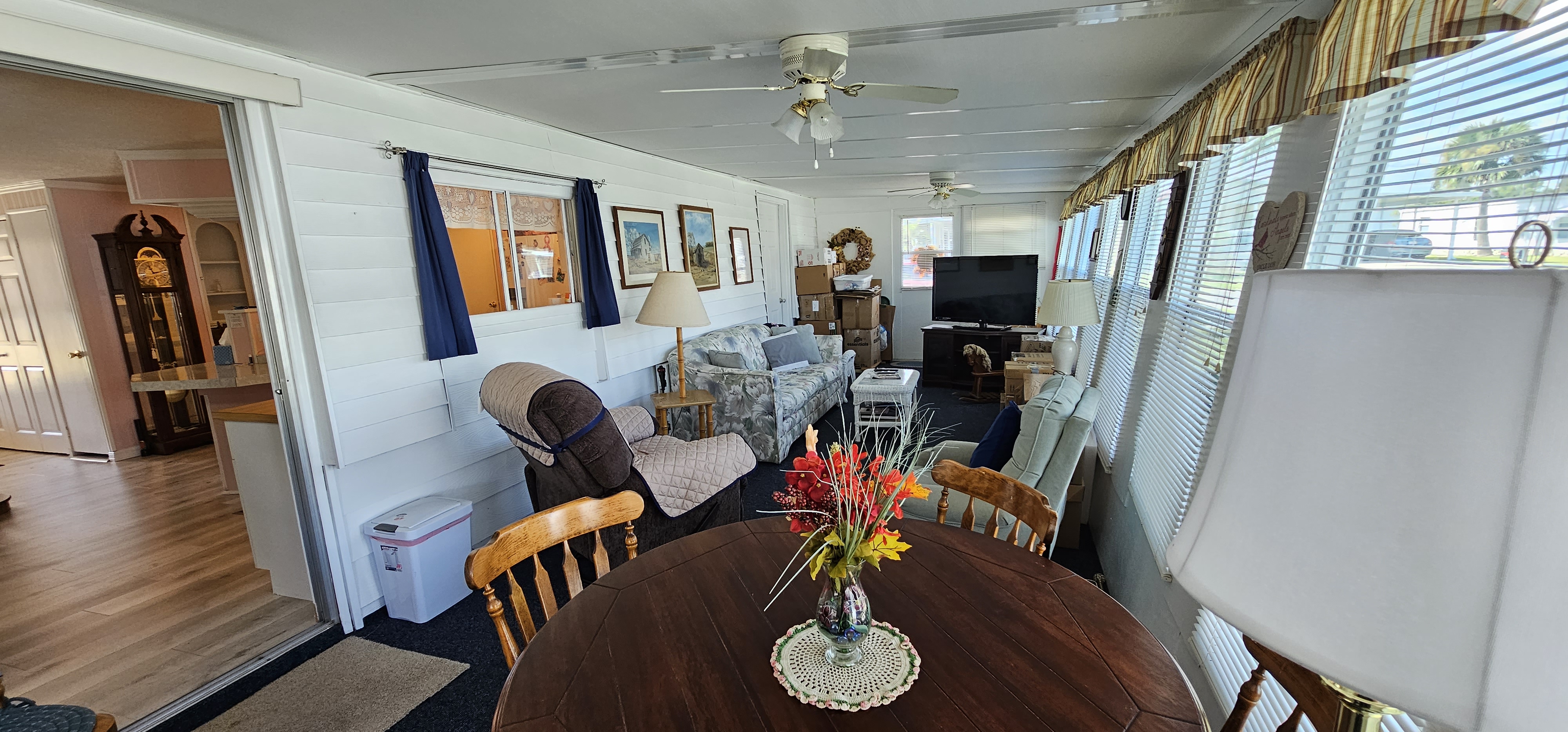 Move-in Ready beautiful fully furnished corner lot with a large floorplan that is great for entertaining. This home has new double pane windows, new vinyl flooring, fresh drywall and paint though out the home, and a spacious Florida room. In addition, there is also new AC and duct work, insulation and vapor barrier throughout. Once outside, a beautiful carport with a screen Lanai area, and storage shed awaits- which adds plenty of room for outside laundry, beach chairs or bicycles.