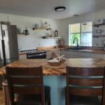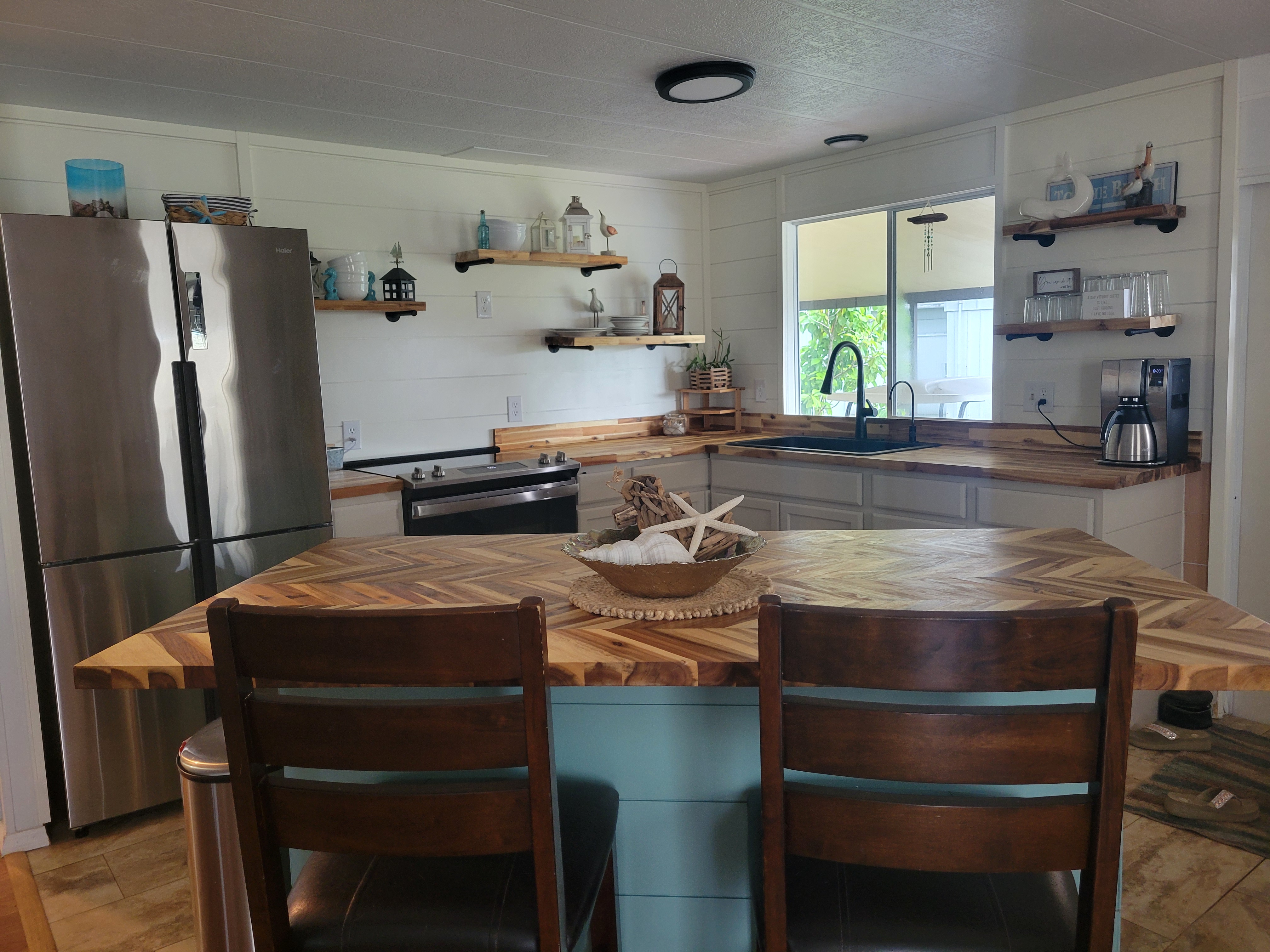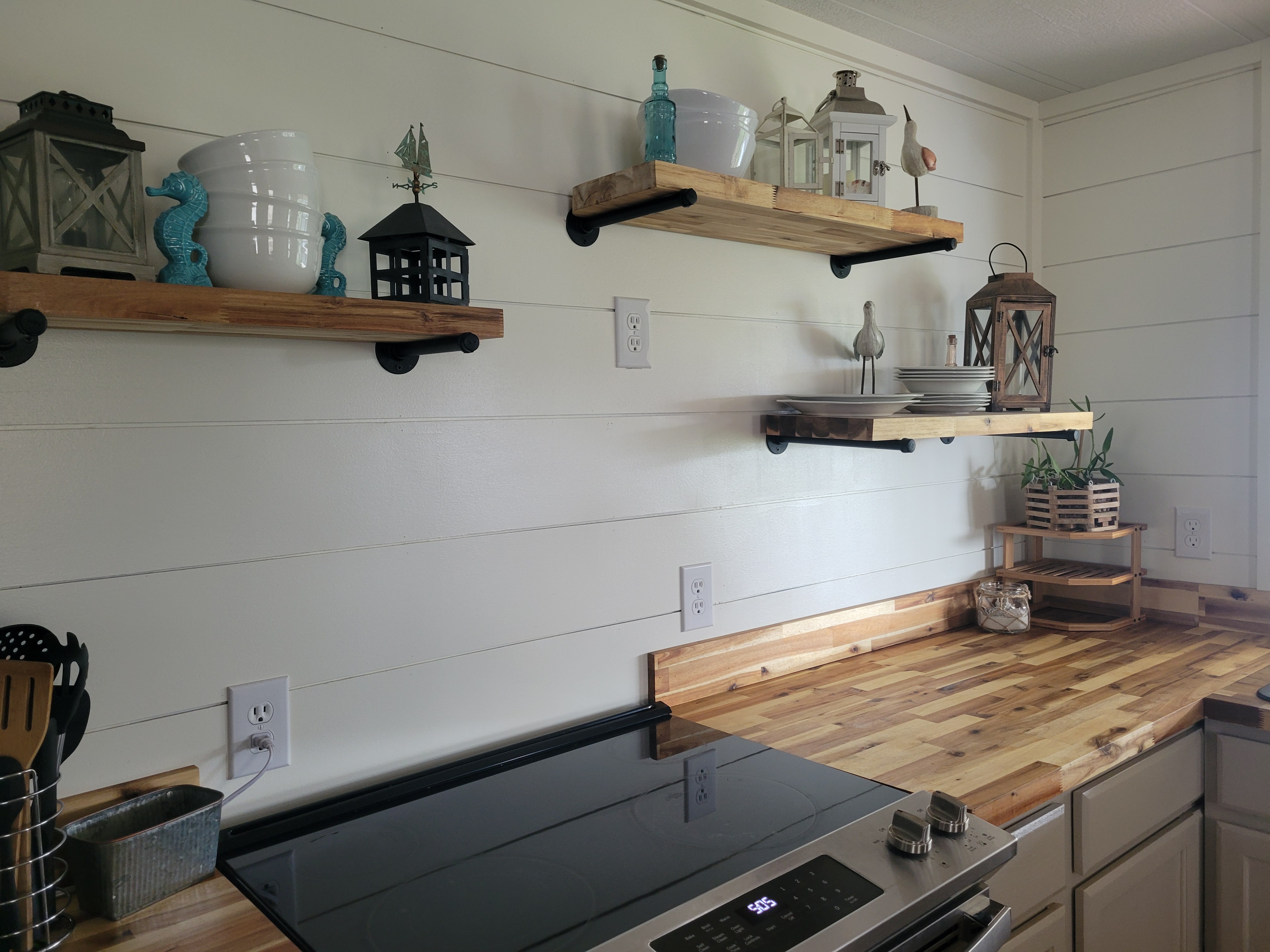 Step into this beautifully updated home featuring a stunning kitchen designed for both culinary creativity and social gatherings. The spacious center island offers ample room for food prep and entertaining, while warm butcher block countertops and sleek stainless steel appliances create a perfect blend of rustic charm and modern style. Shiplap wall accents and matching butcher block shelving add character and cohesion throughout the space.